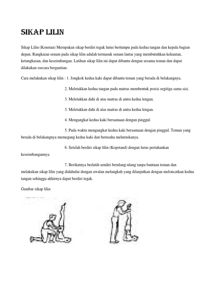Sikap Lilin Yang Benar Kami from imgv2-2-f.scribdassets.com Proses pembelajaran sikap lilin penggunaan alat bantu alat bantu yang digunakan dalam latihan ini, yaitu berupa orang dengan berbagai posisi, benda dalam berbagai bentuk antara lain. Sikap lilin ialah bentuk latihan keseimbangan pada senam dasar dengan posisi badan lurus dan kedua tungkai rapat dan lurus ke atas dengan bertumpu pada pundak (seperti posisi lilin berdiri). Cara melakukan sikap lilin — sikap lilin adalah sikap tidur terlentang dengan posisi kedua kaki terangkat ke atas dan kedua kaki rapat yang saling bersentuhan, pinggang ditopang kedua tangan dan… Adapun, tumpuan sikap lilin terletak pada tubuh bagian atas yang ditopang oleh kedua tangan. Adapun cara melakukan sikap lilin sebagai berikut. Sikap lilin merupakan sikap yang dibuat dari tidur terlentang kemudian mengangkat kedua kaki (rapat) lurus ke atas dengan kedua tangan menopang pinggang. Sikap lilin adalah gerakan mengangkat kaki ke atas sampai pundak yang menyerupai suatu lilin. Melakukan sikap lilin tidak semudah kita melihatnya, perlu kekuatan otot perut yang kuat dan juga kekuatan tangan untuk menopang pinggang.